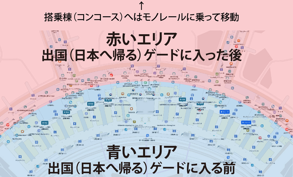 | 第一(第二)ターミナル(店) | 「入国GATE〜出国GATEまでの通常のエリア(下記の地図では青)」と「出国GATEに入ったあとのエリア(下記の地図では赤)」の2エリア。出国GATEに入ったあとのエリアを通ったら通常エリアには戻れない。 |