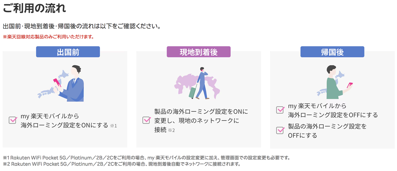 | 通信の準備2/楽天モバイルの設定確認 | 楽天モバイルは元々海外ローミング設定でオンライン上で選ばれていましたが、念のためmy Rakuten Mobileから確認しておきましょう。(海外でもデータ通信が2GB無料) ●海外に行く前に「オンライン上(my Rakuten Mobile)の設定で」海外ローミングがONになってるか確認。 ●現地に着いたら「機種上の設定で」海外ローミングをONにする。私ははじめこれ知らなくて軽くテンパりました。 ![]() |