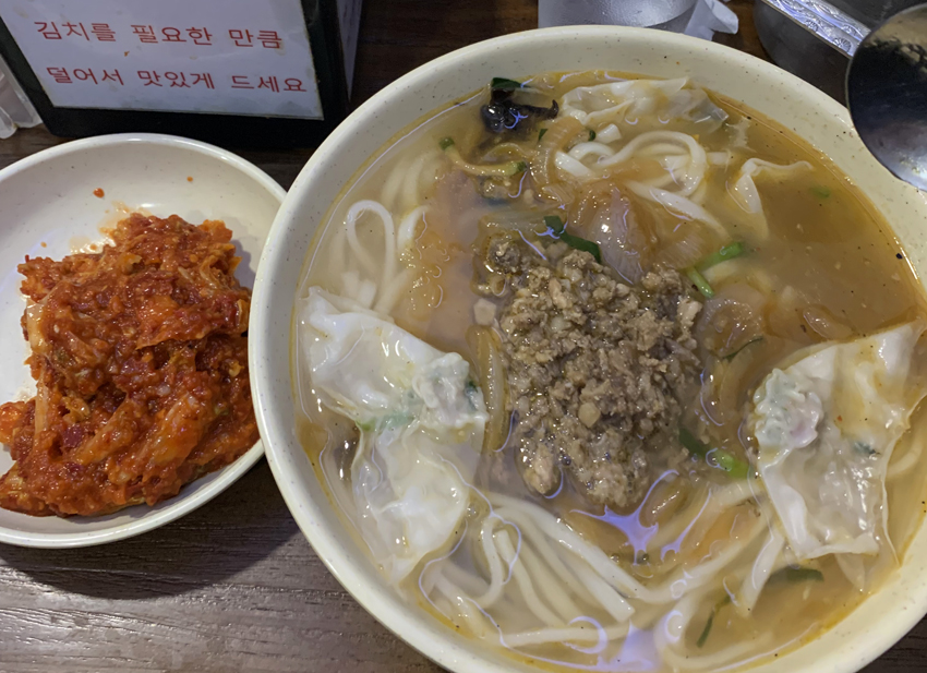 「人気店でけっこう混んでた。マンドゥ(餃子)とカルグクス(麺料理)を食べたかったがかなり量が多いらしかったので軽くマンドゥが入ってるカルグクスを注文。2階へ通されて前金12,000ウォン現金払いしました。(たぶんクレカでもOK)。付いてくるキムチがかなりにんにくと唐辛子が効いてて頑張ったが半分くらいが限度だった。明日の夕方くらいまで口臭残ることが決定。出汁が何かわからなかったが味はまーまー良い感じだった。」