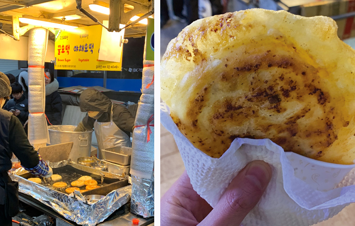「ネット情報では、1つ2500ウォンと書いてあったので現金でぴったり用意して渡したらなんか聞かれたけどわからなくてうなづいたらブラウンシュガー味をもらいました。欲しかった野菜は3000ウォンに値上げされてました。やられた。。でも行列ができるだけあって揚げパン焼きのような生地で納得の味でおいしかったです。熱かったから食べる時は注意。3種あってもう1つは小豆らしいです。次行ったら野菜と小豆買います。」