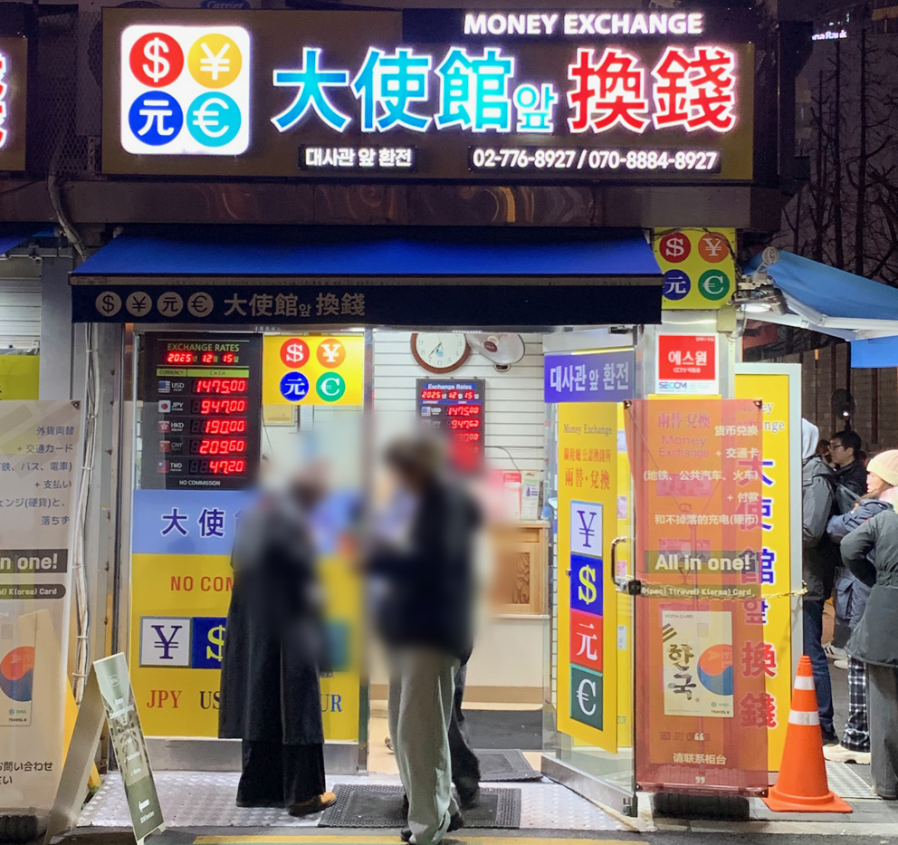 両替ですが、明洞の街中の両替所のほうがレートが良いので大きめの額を交換(空港のGATE出る前の両替所はRate864.00で、街中のはRate942.00だった。計算としては5万×9.42=471,000ウォンでした。しかし、さらに上のレート店があって写真の大使館前両替ではRate947.00でした。この時点ではこの店が一押しです。)